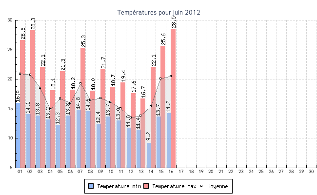 | 16 | 14.2 °C | 28.5 °C | 20.5 °C | 0.8 km/h (9.6 km/h) | OSO |